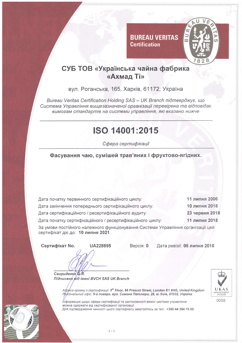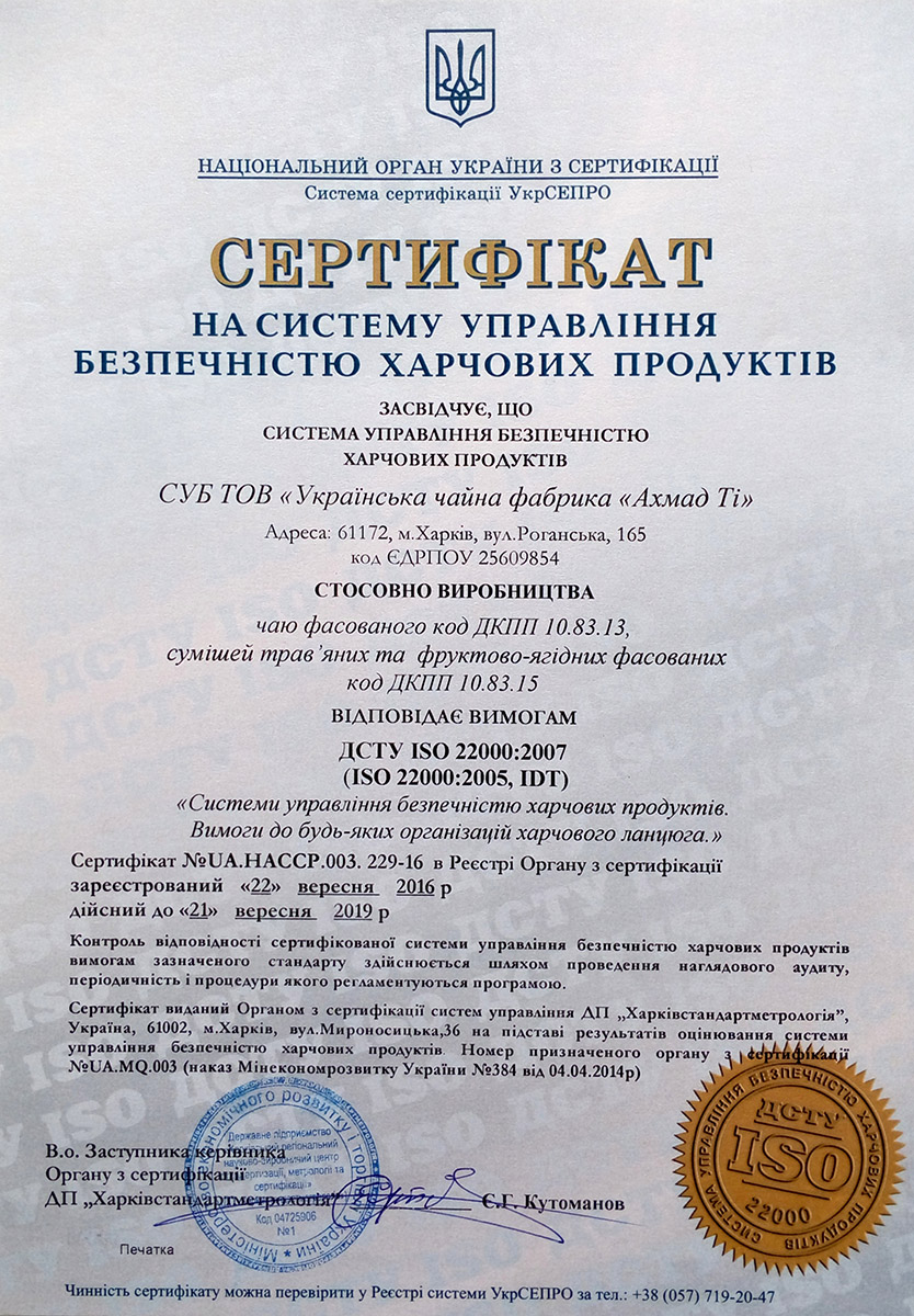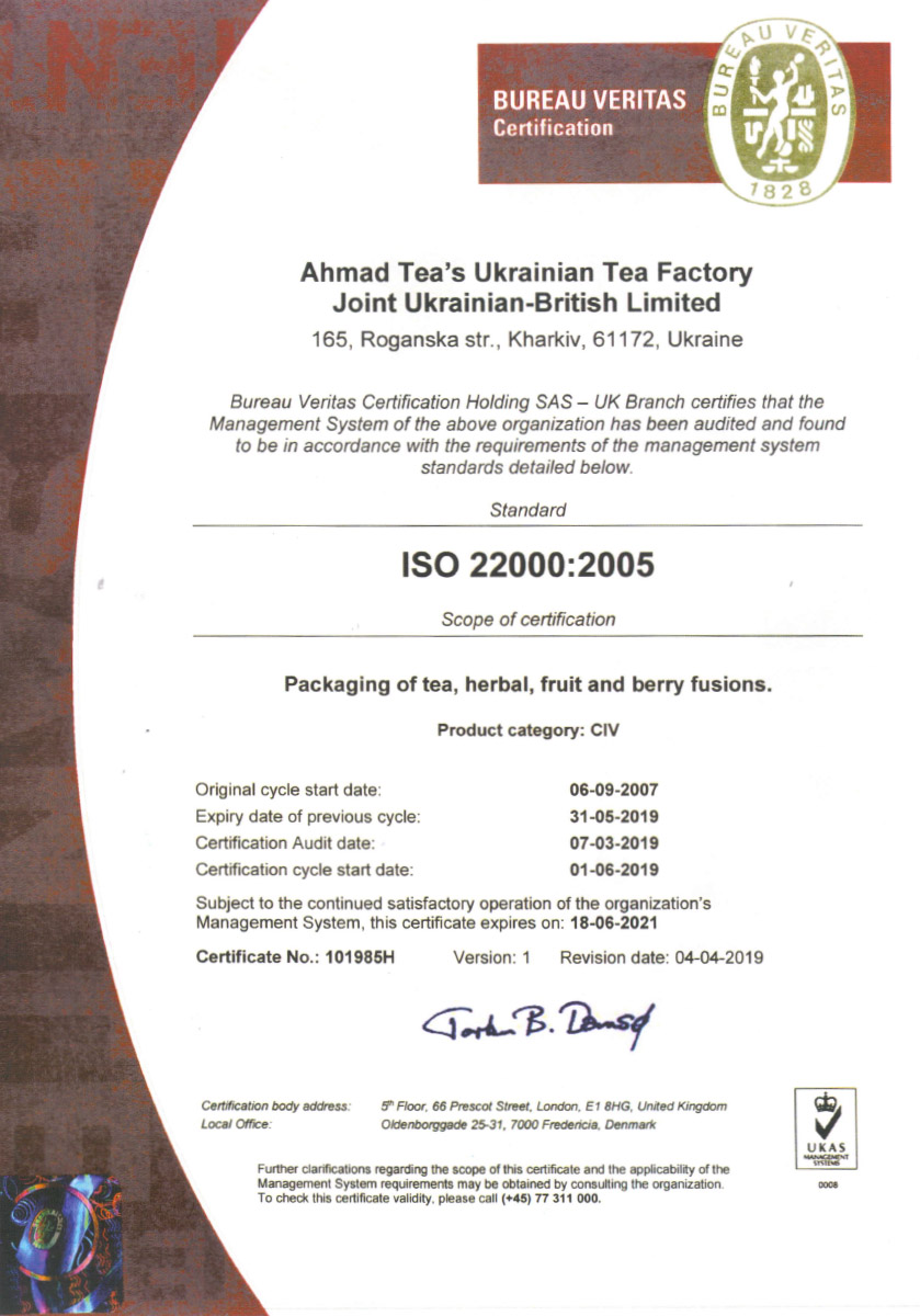 Întreprinderea comună ucraineană-britanică „Fabrica de ceai ucraineană Ahmad Tea London” este una dintre cele mai avansate plante de ceai din Ucraina. Produsele sunt ambalate pe linii moderne, modernizate în mod constant, inclusiv două dintre cele mai puternice mașini de umplere IMA C2000 din Ucraina, fiecare capabil să producă până la 600.000 de saci de ceai pe zi. Ceaiul produs de fabrică este protejat de falsuri folosind echipamente de înaltă tehnologie, marcând fiecare ambalaj cu un cod unic care vă permite să urmăriți destinația cu exactitate într-o anumită regiune a țării, precum și să folosiți panglici holografice și folie specială.