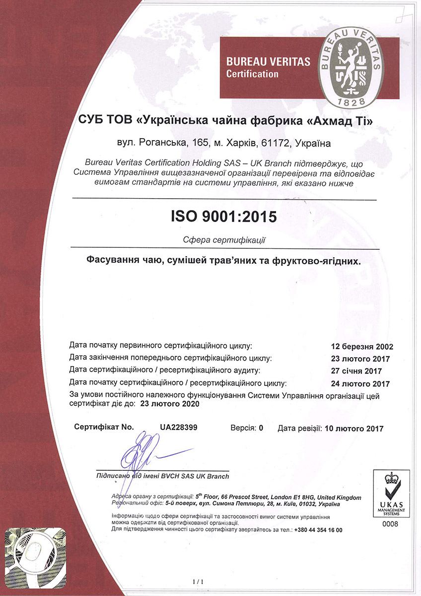 Întreprinderea comună ucraineană-britanică „Fabrica de ceai ucraineană Ahmad Tea London” este una dintre cele mai avansate plante de ceai din Ucraina. Produsele sunt ambalate pe linii moderne, modernizate în mod constant, inclusiv două dintre cele mai puternice mașini de umplere IMA C2000 din Ucraina, fiecare capabil să producă până la 600.000 de saci de ceai pe zi. Ceaiul produs de fabrică este protejat de falsuri folosind echipamente de înaltă tehnologie, marcând fiecare ambalaj cu un cod unic care vă permite să urmăriți destinația cu exactitate într-o anumită regiune a țării, precum și să folosiți panglici holografice și folie specială.